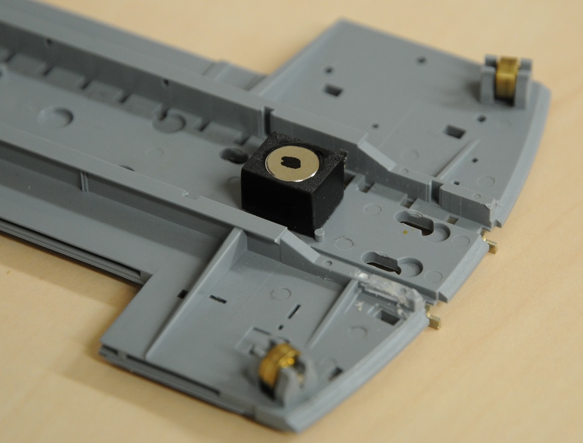 Der Magnet wird unter der Bühne festgeklebt; Höhe, Abstand und die Magnet-Richtung vorher ausprobieren, damit der Hallsensor zuverlässig auslöst.