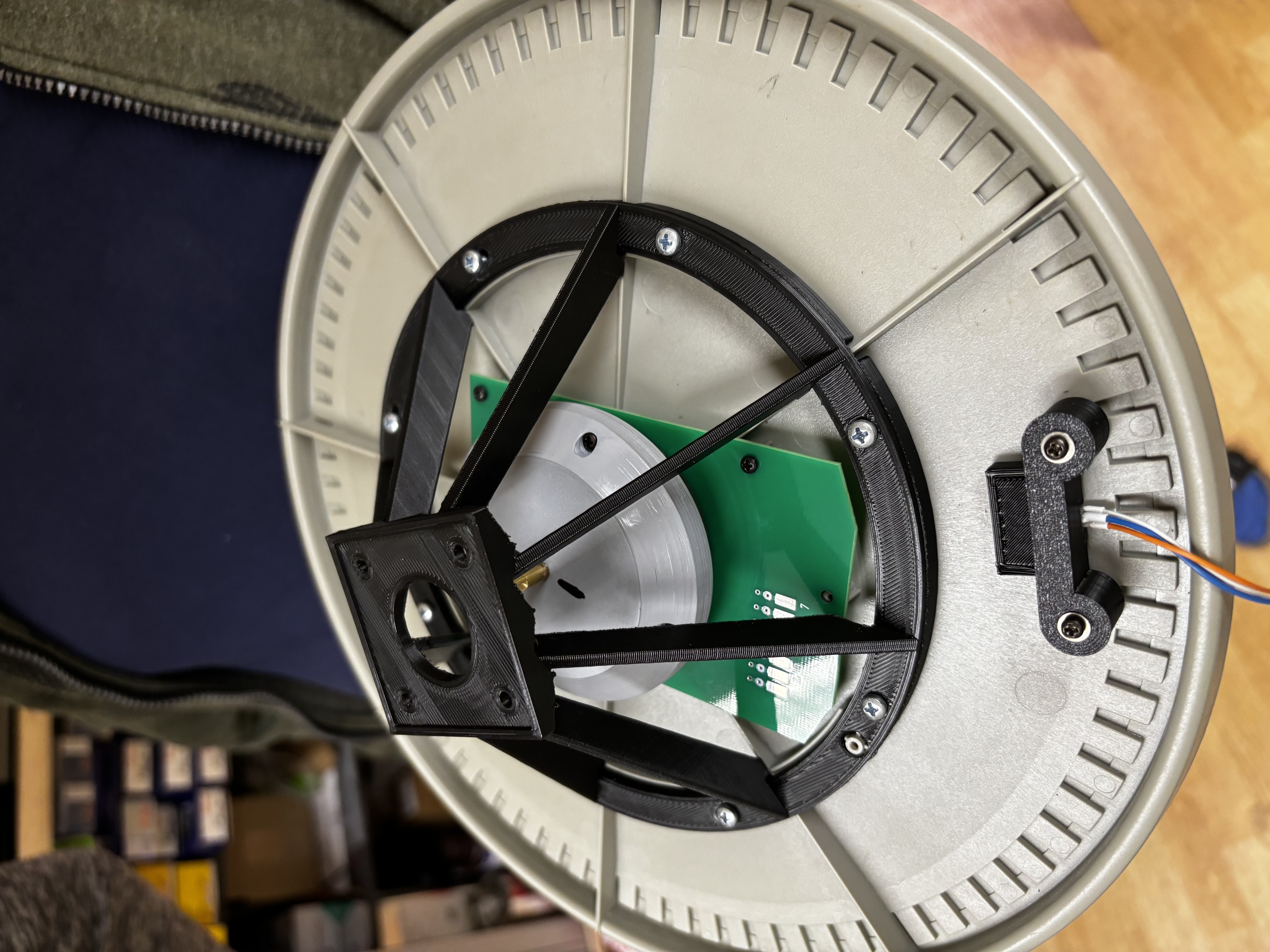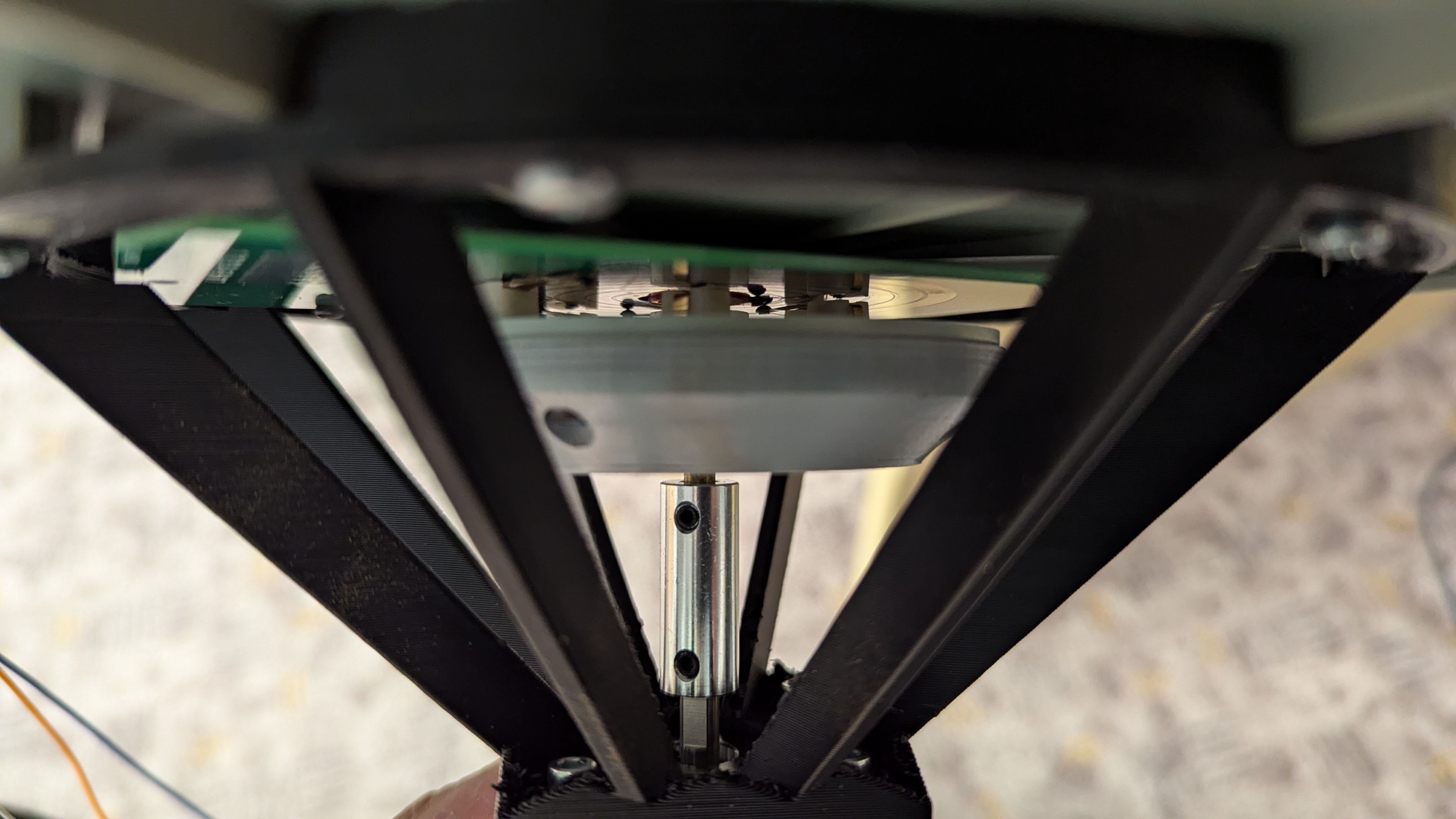 Während die Drehscheibe freischwebend auf dem Motor stehend wunderbar ruckelfrei lief, war in der Anlage montiert ein Ruckeln, v.a. bei höheren Geschwindigkeiten wahrzunehmen. Das Gewicht des Steppermotors zieht die Scheibe nach unten und verwindet sie minimal, was sich dann im Ruckeln äußert.