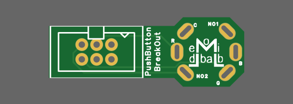 Dafür gibt es das Push-Button Breakout Board, das im wesentlichen die Anschlüsse des RGB-Tasters auf einen 6-poligen Wannenstecker legt. Damit kann man, wie von der MLL gewohnt, ein Kabel mit zwei Pfostenbuchsen unter der Anlage verlegen und an beiden Seiten bei Bedarf abstecken.