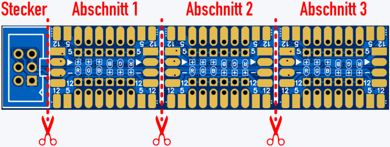 Die Abschnitte 1 bis 3 sind noch am Stück. Lediglich der Steckerabschnitt ist entfernt, weil beispielsweise das Haus über eine andere Schnittstelle verfügt als auf der Platine vorgesehen.
