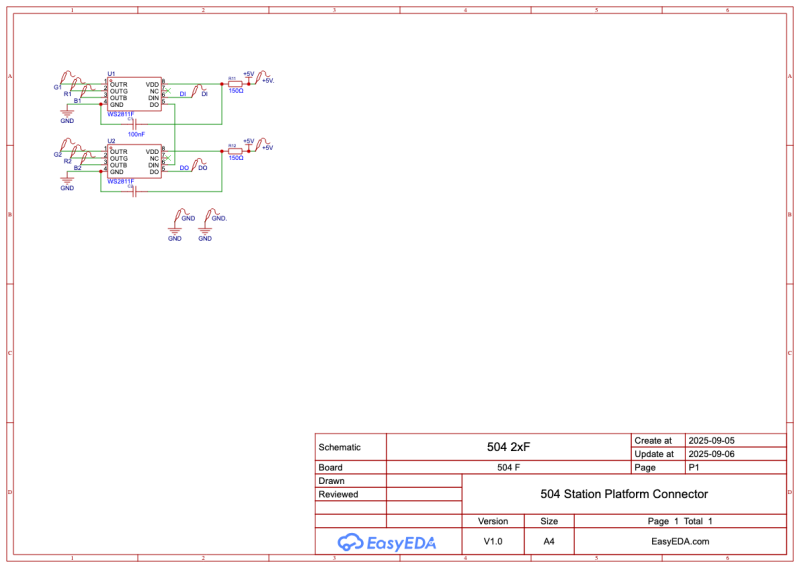 Auf dem Pflichtenheft standen zweimal drei Kontakte (+5V, Data In/Out, GND), die mit denen der WS2812B-LEDs übereinstimmen, sodass die neue Platine sich an jeder Stelle genauso einfach in den Strang integrieren lässt wie eine WS2812B. Auch die Lötpads der einzelnen LEDs sollen gut mit normalem Lötkolben erreichbar sein (nicht so schwer zu erreichen wie bei den WS2811-Modulen). Aufgrund der daraus resultierenden Platzverhältnisse war genug Platz für zwei WS2811F je Platine.