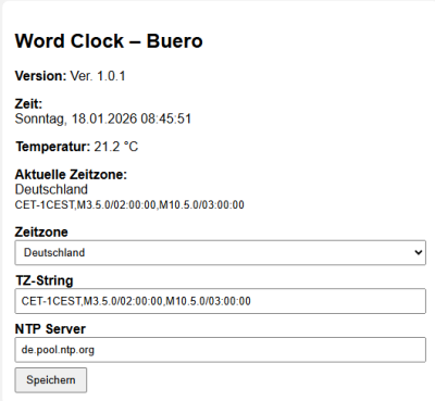 Hierzu gibt es die Zeilen „Zeitzone, TZ-String und NTP-Server“. Nach Änderung auf speichern klicken und die Uhr stellt sich entsprechend um.