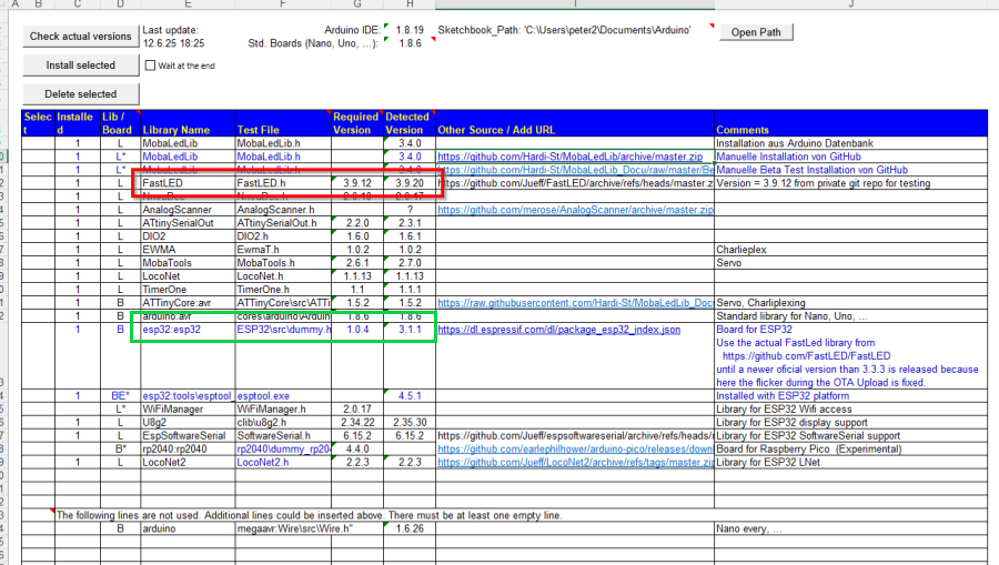 und die FastLED wird aktualisiert. Danach sollte als „Detect Version“ die 3.9.12 angezeigt werden.