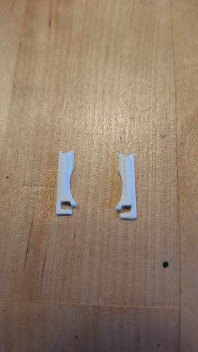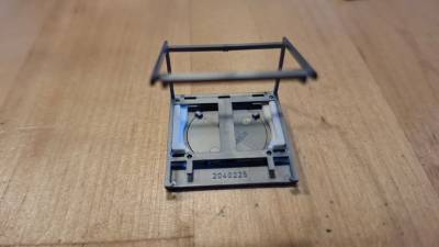 Der silberne Rahmen muss mit der Feile bearbeitet werden, um Platz für die LEDs zu schaffen. Die rot markierten Stege werden im Bereich der vertikalen Stege und der runden Rastnase auf 1mm dicke heruntergefeilt. ACHTUNG: es ist sehr zerbrechlich, daher nur mit kleinen Schlüssel- oder Modellbaufeilen per Hand feilen. die kleinen 3D-Druckteile können als Schablone für die Aussparung hergenommen werden: